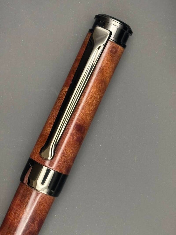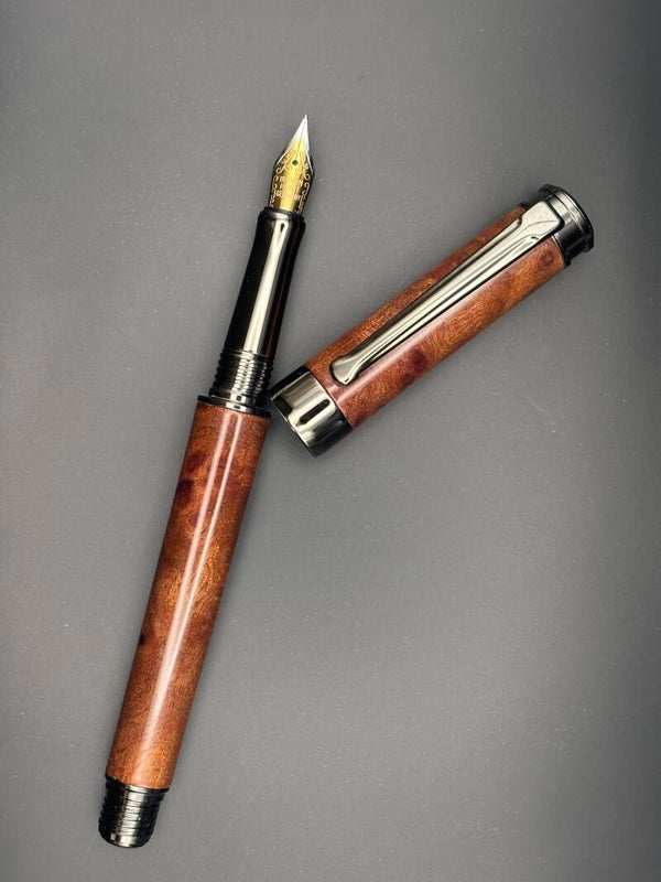 Unieke handgemaakte vulpen van hoge kwaliteit. De pen is gemaakt van "red burl" en wordt geleverd met een standaard blauwe vulling én een converter welke zelf met inkt is te vullen. De pen wordt in een geschenkverpakking geleverd.
